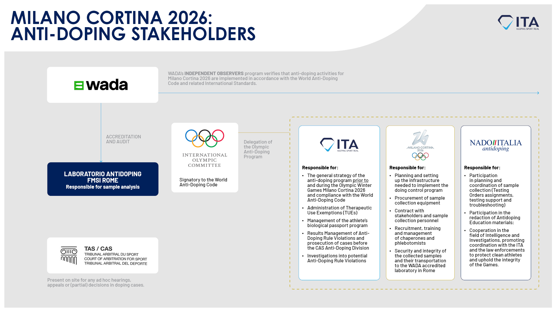 To deliver a robust and comprehensive anti-doping program for the Olympic Winter Games Milano Cortina 2026, the ITA is collaborating with various organisations. Here is a summary of the roles and responsibilities of each one of them (click here for full view):